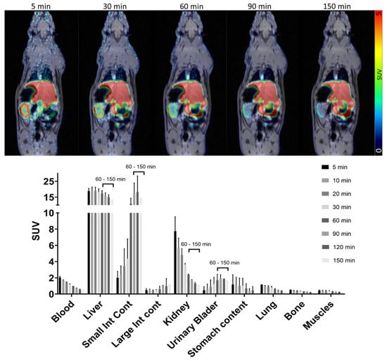 The dynamic biodistribution of [18F]MK-7246 in rats (n = 2) over the 150 min PET/MRI demonstrated low signal uptake in the majority of the organs, except excretion organs such as the liver. As opposed to humans, beta cells of rodents do not express high levels of GPR44, and thus, the pancreas was not visible. The kidney displayed a fast uptake of [18F]MK-7246 followed by a rapid washout, whereas the liver displayed a high uptake of [18F]MK-7246 followed by excretion starting at 60 min. The liver excretion corroborated the simultaneous signal increase of [18F]MK-7246 in the small intestines where the bile containing the radioactive compound was discharged (Figure 6).