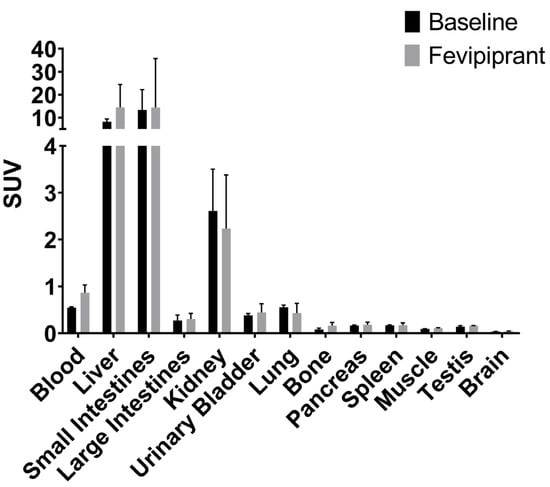Endpoint biodistribution 90 min post-injection of [18F]MK-7246 in n = 3 baseline rats and n = 3 rats injected with GPR44 antagonist Fevipiprant (1 µmol).