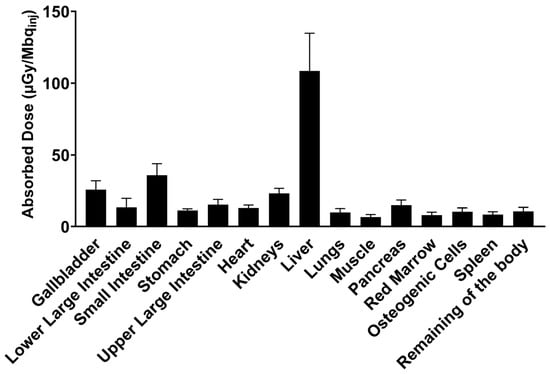 The absorbed radioactive dose was highest for the liver where the main excretion of [18F]MK-7246 occurs (Figure 8). The predicted human effective dose (ED) extrapolated from the RT in rats is 14.55 ± 2.75 µSv per MBq of injected [18F]MK-7246.