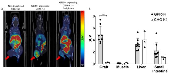 Frozen sections of CHO-K1 cells expressing GPR44 (uptake signal = 664 ± 298.5 Bq/MBqinj, n = 10) showed a significantly higher binding of [18F]MK-7246 compared with frozen sections of non-transfected CHO-K1 negative controls (uptake signal = 34.73 ± 7.89) (**** p < 0.0001) (Figure 5A).