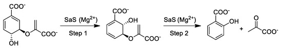 Figure 1. Scheme highlighting the reactions catalyzed by SaS in mycobacteria. In the first step, chorismate is converted to isochorismate, which is then transformed to salicylate, with the release of pyruvate.