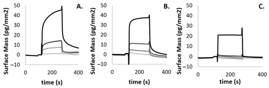 Figure 3. Quantitative binding kinetics of Mab-SaS vs. 1 (A), 2 (B), and 3 (C), measured by GCI. All curves were blank subtracted. Experiments were performed in triplicate. All the quality assessments (i.e., χ2 shown in Table 1, parameter errors, and residual plots were acceptable; the sensorgrams had sufficient curvatures and the kinetic constant koff were within the measurable range) were fulfilled. Descriptive Statistical Analysis was employed to calculate the mean of the obtained values of kon, koff, and KD as a measure of central tendency; standard deviations of the former values were computed as a measure of dispersion.