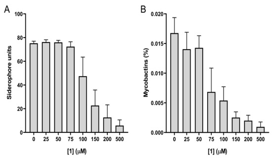 The antimycobacterial activity of 1 was tested on Mab, in iron-limiting conditions, using the chelated Sauton’s medium. The compound did not show any effect up to a concentration of 500 μM. Considering its lack of activity on Mab, the ability of 1 to inhibit the production of siderophores was tested on M. bovis BCG, against which it exhibited antimycobacterial activity at 500 μM [16]. As shown in Figure 4, the concentration of siderophores and mycobactins dropped as the compound concentration increased, confirming that compound 1 interfered with their production.