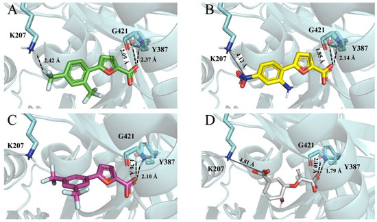 As expected, the binding mode of the cognate ligand, observed in the template X-ray structure of MbtI (PDB code: 6ZA4) [17], was substantially retained in the Mab-Sas model: all the compounds were predicted to form interactions with two conserved residues of the binding pocket, namely Y387 (Y385 in MbtI) and G421 (G419 in MbtI). More specifically, the carboxylate moiety established two well-oriented H-bond interactions with the side chain of Y387 and the backbone of G421. Notably, the analog that was empirically proven to be responsible for the increased affinity (i.e., 1) participated in an extra interaction with the side chain of K207 through its trifluoromethyl substituent (Figure 5A). A salt bridge interaction with the same residue was expected to be caused by the presence of a nitro group in the same location (2, Figure 5B). Visual assessment of the top-scored docking pose of 3 revealed no additional interactions (Figure 5C). Remarkably, these slightly different docking poses were responsible for diverse MM-GBSA binding free energies (∆G—see the experimental section for methodological details). In detail, the obtained values agreed with the experimentally measured affinity data, being the ∆G returned by 1 (−47.27 kcal/mol) better than those computed for 2 (−44.76 kcal/mol) and 3 (−44.29 kcal/mol). Finally, the same docking protocol was applied to chorismate. In agreement with the available experimental data (Km = 58 µM), the computed binding free energy (−38.80 kcal/mol) as well as the obtained docking pose (Figure 5D) were close to those returned by the other investigated compounds, further corroborating the robustness of the adopted docking procedure. More specifically, chorismate was predicted to establish a salt-bridge interaction with K207 (as compound 2) and two H-bond interactions already observed for all the other compounds, namely with the side chain of Y387 and the backbone of G421.