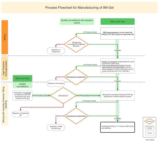 Process flowchart for manufacturing of IMI-Gel. IMQ nanocrystals are manufactured in a wet media ball-milling process, followed by an in-process-control of the resulting mean particle size and the polydispersity index. If both parameters comply with the acceptance criteria of a z-average of 400 ± 200 nm and a PdI < 0.3, the jojoba wax phase (together with the remaining stochiometric amounts of Aqua conservata DAC and polysorbate 80) are added and homogenized to fine-disperse the nanoparticle emulsion. If the formulation appears homogeneous, a stochiometric amount of a precisely neutralized Carbopol 974P gel (pH 6.5–7.0) is added and mixed with the emulsion. If the IPC of the homogeneous appearance of the formulation complies, the formulation is transferred into 7 mL Aponorm tubes.