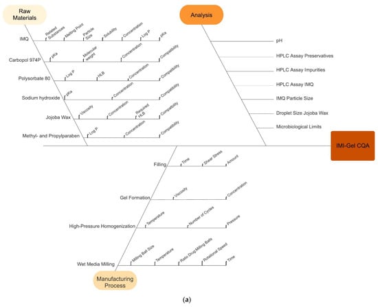 In risk assessment, factors affecting the CQAs for IMI-Gel from the input materials and during manufacturing are identified by using an Ishikawa diagram and evaluated for their criticality in a risk-estimation matrix. Figure 2a depicts the Ishikawa diagram for IMI-Gel. Figure 2b depicts the major results out of the respective risk-estimation matrix for IMI-Gel (for the original matrix, see Table S1). Table 2 lists the identified CMAs.