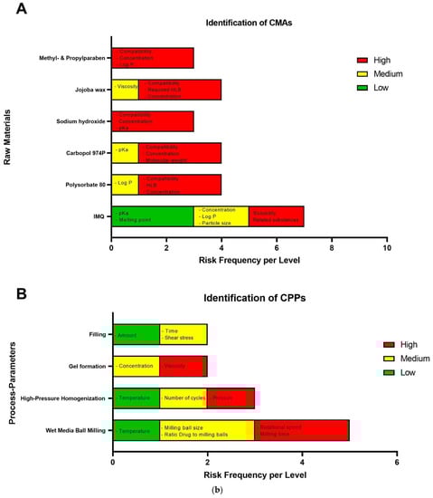 (a) Ishikawa diagram for the IMP IMI-Gel showing the critical parameters affecting the quality of the IMP related to the raw materials, the manufacturing process and the analytical characterization. Additional factors not depicted here are “Environment” and “People”. (b) Frequency histogram for identification of critical material attributes (CMAs) (A) and critical process parameters (CPPs) (B) for the IMP IMI-Gel showing the critical parameters affecting the quality of the IMP related to the raw materials and for manufacturing. CMAs and CPPs are categorized as low (in green), medium (yellow) and high (red).