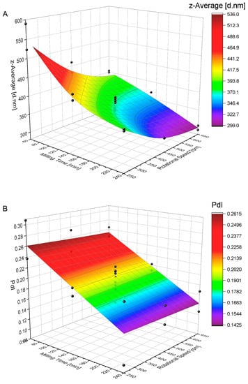 In wet media milling, the frequently studied process parameters significantly affecting the breakage rate of the drug particles are milling time, milling medium (most importantly bead size and the amount of milling medium, e.g., number of beads), milling speed, drug amount and milling design [18,34,35,36]. In the current study, the effect of factors such as (a) the rotational speed (X1) and (b) the milling time (X2) on the following CQAs are studied during wet media ball milling: (I) the particle-size distribution measured as the responses of the intensity-weighted mean hydrodynamic particle size (z-average [d.nm]) and (II) the polydispersity index. A face-centered CCD is applied to determine the optimal process parameters for a mean particle size in the range of 300–400 nm and with a minimal PdI. Other parameters, including drug amount, type and amount of milling medium, bead size and milling design, are taken as previously described [22,23]. The response data for all 26 conducted experimental runs are presented in Table A1.
