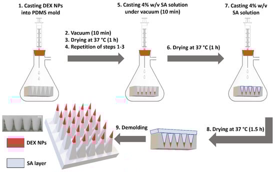 NP-MNs were prepared using a vacuum-deposition micromolding method [] with a modification, as shown in Figure 1. This method was chosen and adopted after applying the optimization process that included the use of different approaches, such as centrifugation. In brief, A PDMS micromold was placed into a vacuum flask, and 150 µL of DEX-loaded NPs were injected into the micromold surface, followed by a vacuum for 10 min and drying at 37 °C for 1 h. This process was repeated one more time, and then 150 µL of 4% w/v SA solution was injected under vacuum through the septum into the micromold surface, held for 10 min, and allowed to dry at 37 °C for 1 h. Afterward, 100 µL of 4% w/v SA solution was added to form the base of MNs and dried at 37 °C for 1.5 h before being demolded. SA-MNs were fabricated by the same method as NP-MNs without adding NPs at any stage of the preparation. The MNs were characterized as depicted in Scheme 1.
