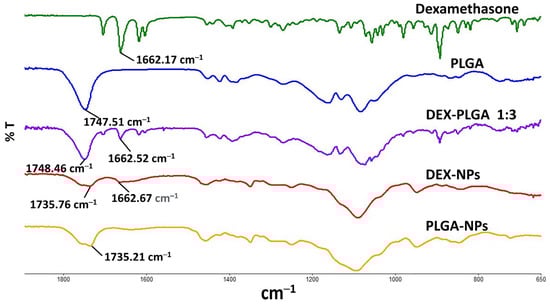 ATR-FTIR spectra of DEX, PLGA, physical mixture, DEX-NPs, and blank-NPs were measured (Figure 2). In the spectrum of DEX, the characteristic peaks were observed at 1704.01, 1662.17, and 1617.57 cm−1, in agreement with previous reports [,]. These peaks were attributed to the stretching vibrations of C=O and C=C (in a ring) double bond framework conjugated to C=O bonds in DEX. The characteristic peak of PLGA was identified at 1747.51 cm−1 due to the ester group []. The spectrum of the physical mixture exhibited relatively similar peaks of DEX and PLGA, including the band at 893 cm−1 that corresponds to the axial deformation of the C-F group in DEX. The spectrum of the DEX-NPs evidenced the contribution of the organic groups of PLGA and solutol HS 15 and did not fully demonstrate the bands equivalent to DEX. This was attributed to the superposition of the bands from all the NP components and could be further explained by the loading content of DEX as well as the relatively low peak intensity. The spectra of blank-NPs and DEX-NPs showed a peak at 1735 cm−1, which was ascribed to the used surfactant, solutol HS 15 (Figure S3), and overlapped with the C=O ester stretching vibration of PLGA. The peak corresponding to C=O stretch in DEX was observed at 1662.67 cm1 in the case of drug-containing NPs, where it was absent in the spectrum of blank NPs, suggesting the successful entrapment of DEX within PLGA NPs with no significant shift that would indicate chemical interaction between the drug and the polymer.