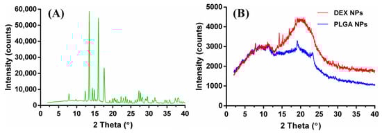 XRD patterns of DEX (A), DEX NPs, and blank PLGA NPs (B).