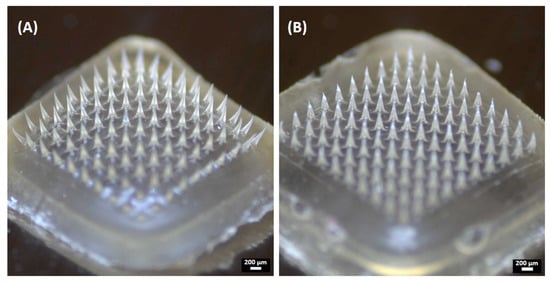 Representative images of the obtained microneedles: (A) SA-MNs and (B) NP-MNs.