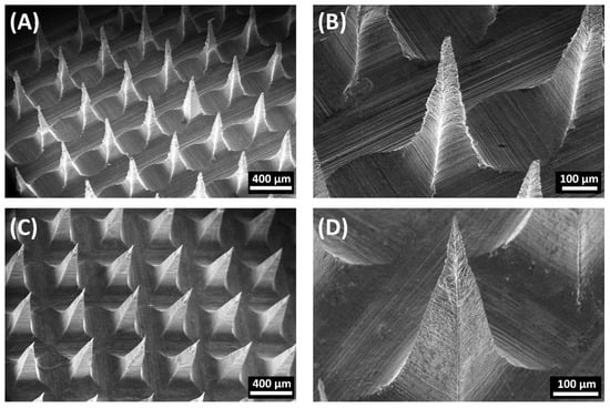 When characterized by SEM, the MN formulations had a quadrangular pyramidal shape and were uniformly distributed on the substrate (Figure 6). SA-MNs and NP-MNs were successfully formed with dimensions of approximately 500 μm height and 200 μm width of the base, as represented in Table 2. Moreover, the SEM images confirmed sharper tips and a smoother surface of the NP-MNs compared to SA-MNs.