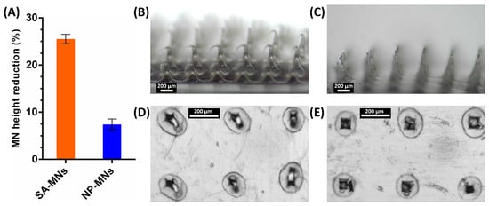Insertion test in the parafilm skin simulant model. MN height reduction for MNs after insertion test using the parafilm skin simulant model (A), results expressed as means ± s.d., n = 10. SA-MNs (B) and NP-MNs (C) acquired with the optical microscope after the insertion test. Representative microscopic images of the first layer of parafilm into which SA-MNs (D) and NP-MNs (E) were inserted.