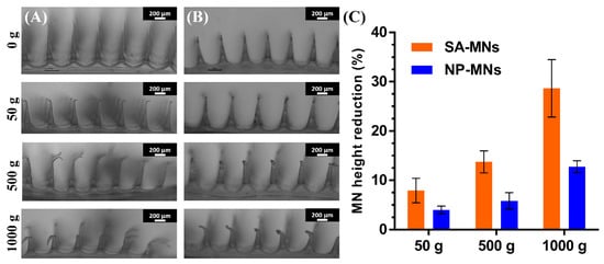 The mechanical strength of MNs against static forces was measured by placing different weights against the MNs. Briefly, SA-MNs and NP-MNs were placed upward, onto which weights of 50 g, 500 g, and 1000 g were placed gently on the top of each patch, respectively. After 5 min, the weights were removed, and morphological changes were evaluated by a HAYEAR 4K UHD microscope camera. The rate of change of the height (µm) of the MNs was calculated and plotted as the percentage of reduction in MN height [,].