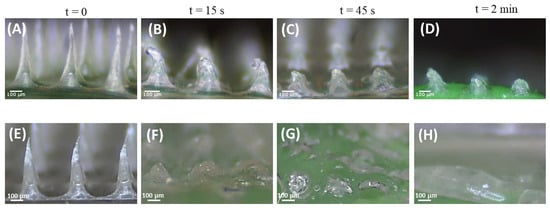Ex-vivo and in vitro dissolution studies of NP-MNs: Representative images of NP-MNs before (A,E) and after dissolution in ex vivo chicken for 15 (B), 45 (C), and 120 s (D) and agarose gel after 15 (F), 45 (G), and 120 s (H). Scale bar 100 µm.