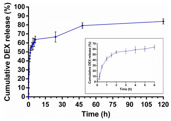 Based on the dissolution study findings, in vitro release studies of DEX from PLGA NPs were performed using a dialysis bag in phosphate buffer saline (pH 7.4) at 37 °C for 120 h. The release data presented in Figure 10 indicate that the release of DEX was biphasic, and a burst drug release was observed in the first 6 h followed by sustained release over 120 h. The results are comparable to previous studies in which DEX was incorporated into the PLGA matrix. The initial burst release could be a result of DEX molecules that are weakly bound/adsorbed to the NP surface [,,]. This release profile would effectively suppress both acute and chronic inflammation [].