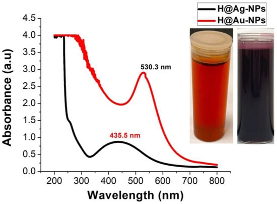 During H@Ag-NP synthesis, the color of the solution transformed from pale yellow to dark yellow after 1 h of incubation in the light, then to faint reddish brown after 2 h. Finally, the solution turned a dark reddish-brown color that was stable after 24 h (Figure 2). The color of the H@Au-NPs was reddish pink after 1 h of synthesis and was stable during the incubation time. The wavelengths of H@Ag-NPs and H@Au-NPs were 435.5 nm [58] and 530.3 nm [59], respectively, indicating the successful synthesis of both NPs. The wavelength of Ag-NPs ranged between 400 and 450 nm [60], while Au-NPs ranged from 500 to 550 nm [61]. The maximum SPR for NPs depends on the electron charge density on the NP surface, particle size, shape, metal type, composition, etc. [62]. Smaller size NPs showed a decrease in their SPR values due to the phase changes resulting from the increased rate of electron-surface collisions compared to larger particles. Increments in NP size shift their wavelength and surge their intensity. The SPR of both H@AgNPs and H@Au-NPs indicate that these NPs have a median NP size. Chelly et al. synthesized Ag- and Au-NPs using a methanolic extract of Rumex roseus, which have SPR at 429 and 549 nm, respectively [63]. Lomelí-Rosales et al. synthesized Ag- and Au-NPs using aqueous extracts from the root, stem, and leaf of Capsicum chinense [20]. It was found that the SPR of Au-NPs synthesized using root, stem, and leaf was 553 nm, 548 nm, and 523 nm, respectively, whereas the SPR of Ag-NPs synthesized using the leaf was 430 nm. The scholar established the stability assay and reported that the stability of Ag-NPs was higher than that of Au-NPs.