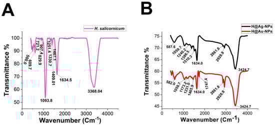 FTIR spectra of Haloxylon salicornicum extract (A) and H@Ag-NPs and H@Au-NPs (B).