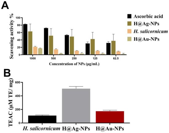 The scavenging activity of H. salicornicum extract, H@Ag-NPs, and H@Au-NPs was examined using FRAP and DPPH assays. The FRAP data revealed that among the tested treatments, H@Ag-NPs have the highest antioxidant activity with TEAC of 506.6 ± 32.7 μM TE/mg, followed by H@Au-NPs and plant extract with TEAC of 173.75 ± 15.3 and 109.4 ± 9.7 μM TE/mg, respectively (Figure 11A). Similarly, the DPPH assay revealed that the scavenging activity of H. salicornicum extract, H@Ag-NPs, and H@Au-NPs occurred in a dose-dependent manner. An amount of 1 mg/mL H@Ag-NPs had the greatest scavenging activity (63.1%) compared to H@Au-NPs (17.4%) and plant extract (21.5%) (Figure 11B). The greater antioxidant activity of H@Ag-NPs compared to other treatments may be due to the higher reactivity and surface chemistry of silver ions that enable the binding of more bioactive antioxidant molecules on the NPs’ surface. Lomelí-Rosales et al. determined the antioxidant activity of plant extracts and their biosynthesized Ag- and Au-NPs using ABTS, FRAP, and DPPH assays [20]. They found that the reducing activity of plant extract was 335.8 ± 51.3, 31.4 ± 5.4, and 120.9 ± 12.6 µM TE when measured by ABTS, DPPH, and FRAR analyses, respectively. Moreover, the inhibitory activity for both Ag-and Au-NPs decreased by 60.7% and 44.7% for ABTS and 34.5% and 52.1% for FRAP compared to plant extracts, respectively. Both NPs also showed no significant change in DPPH activity compared to plant extract. The authors claimed that the reduction in the scavenging activity of NPs compared to plant extract was due to the consumption of plant biomolecules in the synthesis process of NPs. Ag- and Au-NPs synthesized using Plumbago zeylanica showed greater scavenging activity against DPPH with an inhibition percentage of 87.34% and 78.17%, respectively, compared to plant extract and an inhibition percentage of 71.16% and 74.88%, respectively, compared to standard butylated hydroxytoluene [85].
