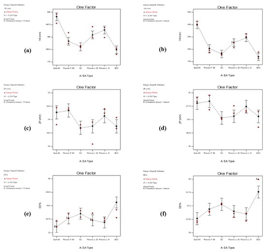 Line plot for the effect of EA on VS (a) with cholesterol, (b) without cholesterol; on ZP (c), with cholesterol, (d) without cholesterol; and on %EE (e) with cholesterol, (f) without cholesterol.