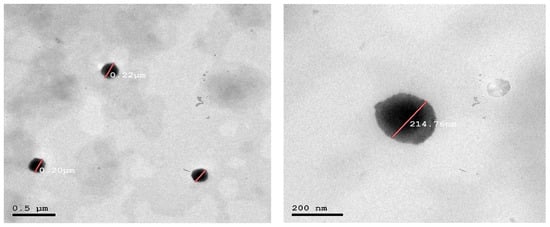 TEM images of the optimized RSM-loaded transferosomal formulation (F12) are illustrated in Figure 3. It is obvious that the transferosomal vesicles were well-identified and spherical in shape with nearly perfect edges. The measured VS was in good correlation (~200 nm) with the results previously obtained from ZetaSizer Nano ZS.