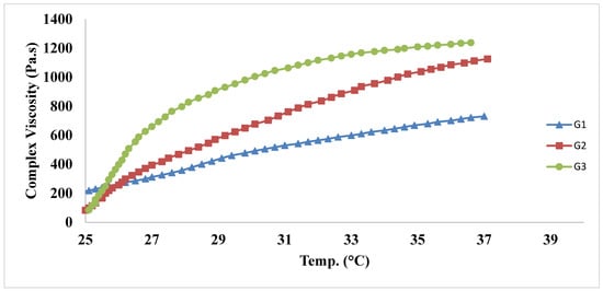 Relationship between temperature and complex viscosity of in situ gels: G1, G2, and G3. Composition of the in situ gels is compiled in Table 3.