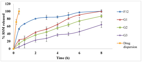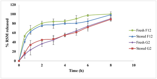 where n is the number of the samples withdrawn, and R and T are the percentage of RSM released from either the freshly prepared or stored formulation (F12), respectively, which is repeated for the freshly prepared and stored in situ gel formulation (G2) at time t [60,61].