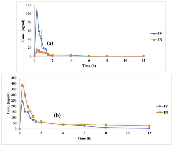 where B and P stand for AUC0-12 in brain and plasma, correspondingly. IN and IV represent intranasal and intravenous administration, correspondingly, and BX is the portion of the drug that reached the brain from blood–brain barrier (BBB) following IN administration. The following equation was used for the calculation of BX [67],