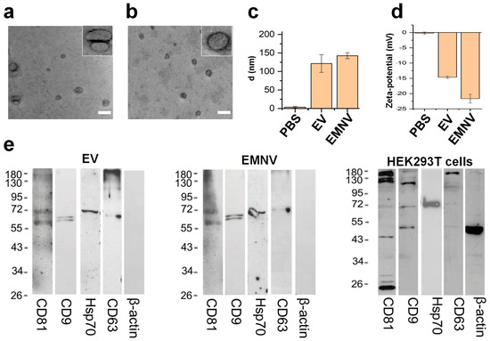 Characterization of EVs and EMNVs. Transmission electron microscopy images of (a) EVs and (b) EMNVs with an enlarged image in the inset (scale bar = 200 nm). Dynamic light scattering analysis of EV/EMNV (c) mean diameter, and (d) Ζ-potential. (e) Western blot analysis of expression of CD81, CD9, Hsp70, CD63, and β-actin proteins in preparations of EVs and EMNVs and in HEK-293T cell lysates.