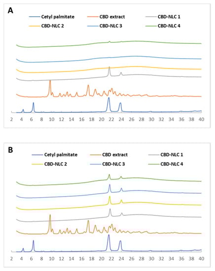 X-ray diffractograms of CP, CBD extract, and CBD-NLCs at the initial time (A) and after storage at 30 °C for 30 days (B).