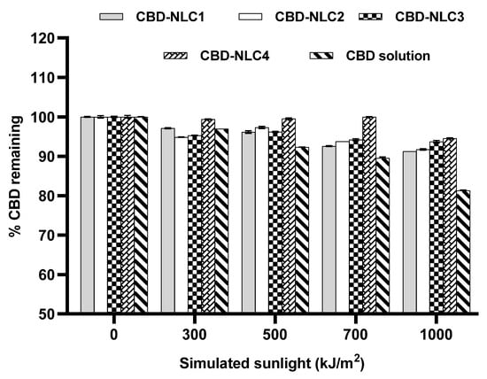 In a previous study, it was reported that only 38% of commercially available products exhibited quantities within 10% of the label range. Moreover, CBD storage at a high temperature (37 °C) and with exposure to light accelerated degradation, with average values of up to 20% and 15%, respectively []. To evaluate the chemical stability of CBD-NLCs, the percentages of CBD remaining after exposure to simulated sunlight at 300, 500, 700, and 1000 kJ/m2 were analyzed by HPLC. Figure 4 shows the percentage of CBD remaining in the CBD extract in ethanol solution and in all CBD-NLC formulations. The amount of CBD remaining in the CBD extract solution was approximately 81% after exposure to 1000 kJ/m2, which was significantly lower than that in the CBD-NLCs (91–95%) (p < 0.05). The higher stability of CBD in the CBD-NLCs indicated stability improvement due to entrapment of the CBD in the lipid matrix of the NLCs. The percentages of CBD remaining for CBD-NLC1 and CBD-NLC2 were comparable (p > 0.05), implying that the surfactants used in this study did not affect the chemical stability of CBD entrapped in the NLCs.