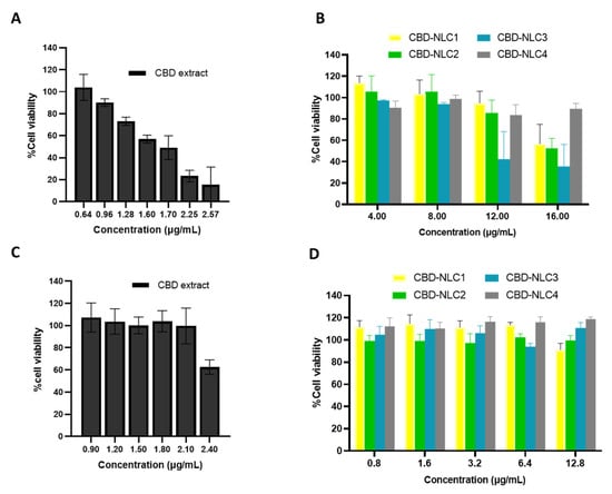 Cell viability after exposure to CBD extract and CBD-NLCs for 24 h of HaCaT cells (A,B) and HDF cells (C,D).