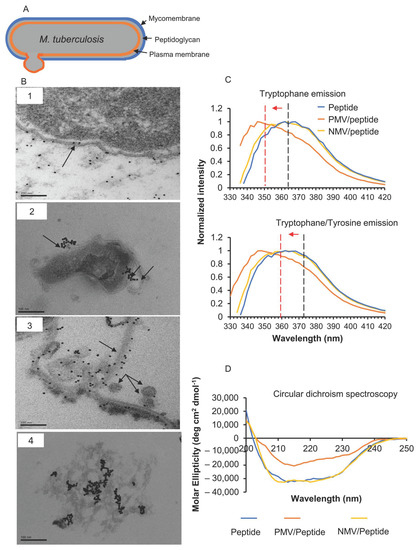 NZX characteristics upon binding. (A) Simplified model of the organization of the mycobacterial envelope. (B) Transmission electron microscopy (TEM) showing the gold-labeled NZX that caused the membrane destabilization of M. tuberculosis (1–4). Scale bar: 100 nm. (C) Representative graph of intrinsic Trp + Tyr (upper panel) and Trp (lower panel) emission spectra of the peptide when interacting with the LUV at pH 7.4. In the presence and absence of vesicles, shifts in wavelength (arrow) and increased fluorescence intensity were recorded. (D) CD structure of NZX in the presence of vesicles. Peptide in PBS was used as the control. Secondary structure content was analyzed with the K2D3 server.