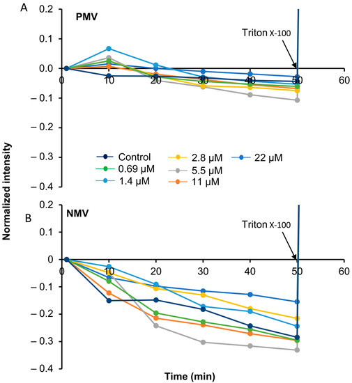 Next, we sought to examine the effect of the peptide on lipid bilayer permeability. PMVs and NMVs loaded with a self-quenching concentration of calcein were incubated with the peptide, and fluorescence intensity was recorded (Figure 3). Membrane permeabilization leading to release of the encapsulated content relieved calcein from the self-quenched environment, leading to an increase in fluorescence intensity. The addition of the peptide (0.69 to 22 μM) to the vesicles did not result in increases in the fluorescence signal. Instead, we noticed a concentration-dependent drop in fluorescence. A gradual decrease in fluorescence intensity was also observed in the control, where this phenomenon is known to be due to a photobleaching effect [29]. The addition of Triton at the end of the experiment resulted in total calcein release, confirming that no membrane rupture was caused by the peptide.