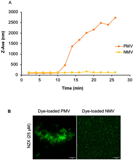 To examine if the decrease in fluorescence was correlated to changes in vesicle size, dynamic light scattering (DLS) was performed. Kinetic measurements were performed on both PMV and NMV over a time course of 30 min (Figure 4A). The addition of 3 μM of the peptide to PMVs gradually increased the Z-average hydrodynamic diameter (Z-ave), along with the polydispersity index (PdI). Increasing the peptide concentration to 25–33 μM resulted in the stochastic fluctuation of Dh and PdI of the PMVs (not shown). In comparison, Dh and PdI were largely unchanged for the low (3 μM) peptide concentration in NMVs. However, increasing the peptide concentration to 25–33 μM induced stochastic fluctuations in Dh and PdI, albeit with much lower magnitudes than those of the PMVs (not shown). These results suggest that additional factors mediate peptide–membrane interactions, which promote vesicle aggregation, in addition to the electrostatic interactions between positively charged residues of the peptide and the negatively charged lipid headgroup.