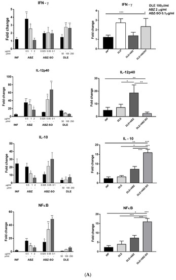 (A). Dose-dependent effects of ABZ, ABZ-SO, DLE, and their combinations on relative mRNA expression of genes for cytokines IFN-γ, IL-12p40, IL-10, and NF-κB in adherent peritoneal macrophages/monocytes (1 × 106 cells/well) after 72 h of cultivation ex vivo. Each drug concentration was tested in triplicates and relative gene expression was calculated via the 2−∆∆Ct method, using data for adherent cells from healthy mice as the calibrator. Significantly different values between infected untreated and treated cell samples are indicated as * p < 0.05, ** p < 0.01, and *** p < 0.001. (B). Dose-dependent effects of ABZ, ABZ-SO, DLE, and their combinations on relative mRNA expression of genes for selected macrophage markers: arginase 1, iNOS, and IFN-γ receptor in adherent peritoneal macrophages/monocytes (1 × 106 cells/well) after 72 h of cultivation ex vivo. Each drug concentration was tested in triplicates and relative gene expression was calculated via the 2−∆∆Ct method, using data for adherent cells from healthy mice as the calibrator. Significantly different values between infected untreated and treated cell samples are indicated as * p < 0.05, ** p < 0.01, and *** p < 0.001.
