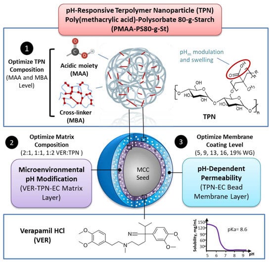 A flow chart of the optimization strategy to achieve pH transition-independent controlled release of VER from a TPN-containing bilayer-coated beads. Formulation strategy for TPN bilayer-coated beads containing weakly basic VER Optimization of TPN composition to achieve pHm modification and pH-dependent swelling, followed by strategic placement of TPN in the bilayer bead matrix and membrane layers are proposed to overcome pH-dependent solubility of VER. Figure created with BioRender.com (accessed on 15 December 2022).
