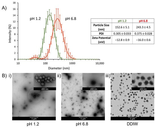 To examine the morphology and pH-dependent behavior of TPN, TEM photographs were taken at pH 1.2, pH 6.8, and DDIW, which showed TPN has a nearly spherical shape. It was observed that at pH 1.2, the size of TPN decreased to less than 200 nm and aggregated due to lack of ionic repulsion as they are unionized (Figure 2B(i)). At pH 6.8 and in DDIW, the edges of the TPN appear unsmooth, likely due to the extension of polymer chains, and minimal aggregation was seen due to ionic repulsion from ionization of the MAA (Figure 2B(ii,iii)). The particle size and zeta potential results correspond with the TEM results in various media, where TPN becomes more negatively charged in the presence of higher pH, leading to more electrostatic repulsion and therefore less aggregation (Figure 2B). These results conform with previous investigations of TPN, where the surface charge of the TPN is primarily contributed by the MAA [,].