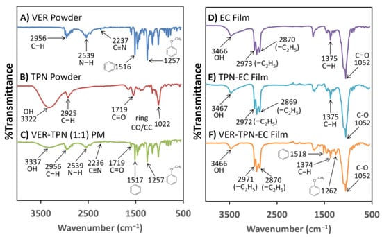 FTIR spectra of (A) pure VER powder, (B) pure TPN powder, (C) VER-TPN (1:1) powder mix (PM), (D) EC film, (E) TPN-EC film, and (F) VER-TPN (1:1)-EC film. Major peaks are denoted and further explained in the text.