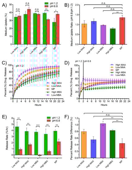 Comparing the levels of the acidic moiety, High MAA showed a high release rate in pH 6.8 (Figure 4E) and lower percent release rate difference (Figure 4F), similar to MP, though the difference in medium uptake was less significant between pH (Figure 4A). This suggested that a mechanism (i.e., supply of proton from MAA to lower pHm) other than medium uptake and retention may be responsible for the enhanced release.