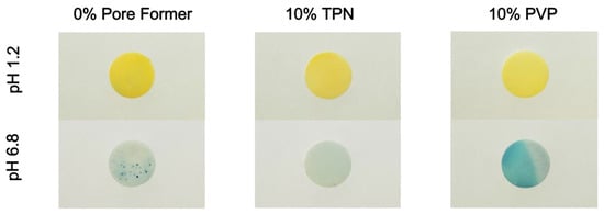 To visualize the pHm by color change, a pH indicator dye, bromocresol green, was incorporated into EC-based matrix films containing 10% TPN with mid-point composition (Table 1) (TPN-EC), or 10% PVP (PVP-EC). The films prepared as described in Section 2.3.1 were incubated in 0.1 N HCl for 2 h with agitation. The films were then removed and gently blotted dry and soaked in pH 6.8 phosphate buffer for an additional 22 h. Photographs of the films were taken using an Olympus E-M10 camera (Olympus Corporation, Japan), after removal from the media, and blotted dry. Each condition was performed in triplicates, and the most representative photographs were selected for the figures.