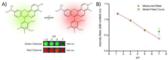 where and R is the ratio of fluorescence intensity at individual pH, Ra is measured ratio at acidic media, Rb is measured ratio at alkaline media, and Ia and Ib are the fluorescent intensities at green and red channels, respectively; the pKa of SNARF-4F was set to 6.4, as per the supplier’s catalog [].