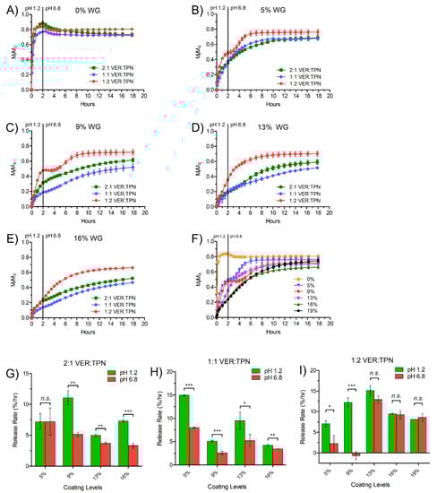 Dissolution profiles showing the effect of VER:TPN ratio in VER-TPN-EC matrix layer and TPN-EC membrane coating level. (A) 0%, (B) 5%, (C) 9%, (D) 13%, (E) 16% weight gain, and (F) 0% to 19% weight gain at 1:2 VER:TPN ratio, and comparison of VER release rates surrounding the pH transition at pH 1.2 (1–2 h) and pH 6.8 (2–3 h) between bilayer-coated bead formulations. (G) 2:1 VER:TPN, (H) 1:1 VER:TPN, and (I) 1:2 VER:TPN at various membrane coating levels. Data are mean ± SD. n.s., not significant, * p ≤ 0.05, ** p ≤ 0.01, and *** p ≤ 0.001.