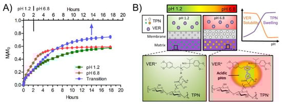 As illustrated in Figure 8B, the advanced performance of the TPN-containing bead can be ascribed to multiple functions of the TPN: (1) pH-dependent swelling that dictates the matrix or membrane permeability, counteracting the pH-dependent solubility of VER, i.e., lower permeability at pH 1.2 when VER solubility is high and higher permeability at pH 6.8 when VER solubility is low; (2) microenvironmental pH modification resulting in acidic pHm in a composite matrix, which facilitates VER solution; and (3) forming pH-dependent ionic and ion-dipole complexation with VER, which retains VER in the nanogel, preventing its precipitation inside the matrix and the membrane. The mechanisms of the multifunctionality of TPN are further discussed below.