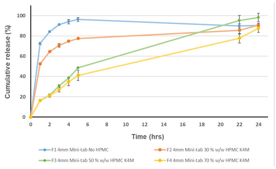 Dissolution profiles of mini-tablets composed of various grades of HPMC K4M. Data presented as mean ± standard deviation.