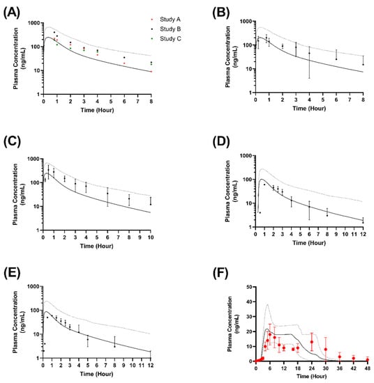 To confirm the predictive performance during validation, prediction of pharmacokinetic metrics to within two-fold (0.5–2.0 fold ratio) of that published in clinical data was accepted [,,]. Furthermore, a visual predictive checking (VPC) strategy was utilised to visually compare predicted concentration–time profiles with retrospective observed data, with predictions valid when the predicted data points overlapped with the observed data sets [,,]. Observed data were acquired from retrospective published studies, extracted using WebPlotDigitizer v.3.10 (http://arohatgi.info/WebPlotDigitizer/ (accessed on 15 September 2022)).