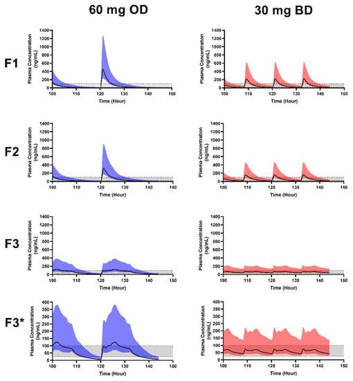 In order to pragmatically assess the impact of HPMC content on pharmacokinetics, dissolution profiles from formulations F1 (no HPMC), F2 (30% HPMC) and F3 (50% HPMC) mini-tablets were used to drive predictions of oral pharmacokinetics using the validated adult model. A dosage of 60 mg once daily and 30 mg twice daily was examined to identify an appropriate dosing approach to target the therapeutic range of 25–100 ng/mL [] (Figure 3).
