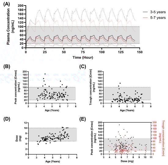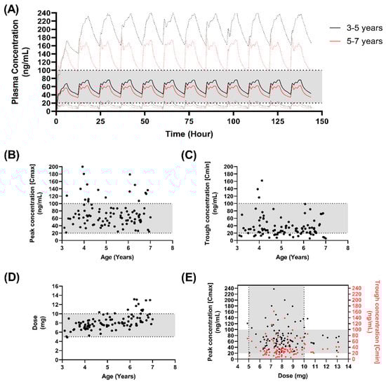 A dose of 350 µg/kg resulted in 36% (3–5-year-olds) and 46% (5–7-year-olds) of subjects with trough concentrations below the lower end of the therapeutic window (Table 7) (Figure 5), with peak concentrations broadly within the therapeutic window (Figure 5B) and mean trough concentrations close to the lower limit (3–5-year-olds: 31.76 ng/mL ± 25.9 ng/mL; 5–7-year-olds: 25.6 ng/mL ± 15.6 ng/mL) (Figure 5C).