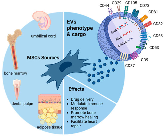 Essential mesenchymal stromal cell (MSC) sources and their extracellular vesicle (EV) phenotypes, cargos (CD29, CD44, CD73, CD105, CD81, CD82, CD63, CD53, CD9, CD37, DNA, RNA, and miRNA), and summarized effects.